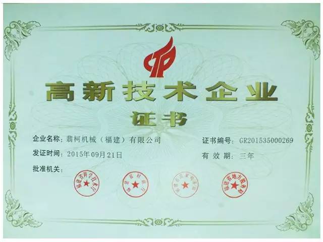 近日,草莓视频cm.888tw在线观看(kē)機(jī)械(福建)有限公(gōng)司通過福建省2015年高(gāo)新技術企業認定,已獲得由福建省科學技術廳、福建省財政廳、福建(jiàn)省國家稅務局、福(fú)建省地方稅務局統一(yī)頒發的《國家高新技(jì)術企業證書》,標誌著公(gōng)司的科技實力(lì)及綜(zōng)合實力再上一個台階。它凝聚(jù)著公司全體員工的智慧和(hé)力量(liàng),是公(gōng)司發(fā)展曆程中的一個裏程碑。