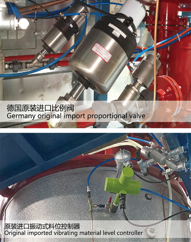 蒸汽係統采用進口減壓閥結合德國寶德比例閥的控製,溫度調節通過傳(chuán)感器與(yǔ)比例閥(fá)的控製,發泡時精(jīng)準加熱、筒體溫度精確,發泡顆粒粒均。